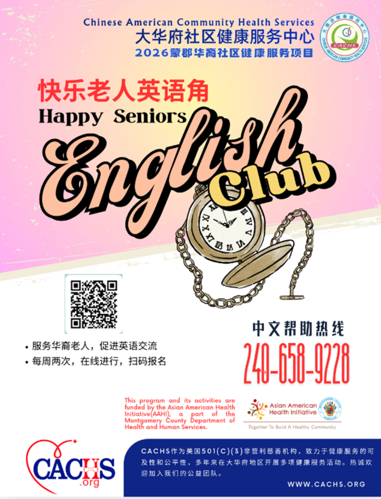 Organization News 2026大华府社区健康服务中心华裔老人网上“英语俱乐部”第二期开班报名 Updated on March 7, 2026 by admin 为了帮助华裔老人更好地适应美国生活,提高生活品质,同时为了帮助华裔老人更多地和孙辈交流,尽情享受天伦之乐,受马州蒙郡政府资助,大华府社区健康服务中心(CACHS)将于2026年上半年继续为蒙郡华裔老人(60岁以上)举办两期 “英语俱乐部”活动,全程免费。活动方式为线上。第一期“英语俱乐部”推进顺利并受到大家的热切欢迎。第二期活动的安排如下:第二期“英语俱乐部”自2026年4月6日起,至6月28日结束。每周两次,分别为周一和周三的晚上7:00-8:00。现在开始接受报名,报满即止。 这是继2024和2025两年连续成功举办四期活动之后,大华府社区健康服务中心第三个年度继续开办“英语俱乐部”。本次活动内容丰富,形式多样,将超过往年。本次俱乐部活动是为蒙郡华裔老人量身定制的免费福利活动,我们会邀请具有丰富英语授课经验的老师,制订丰富实用的授课内容,比如超市、银行、医院、打电话、问路、美国文化等贴近日常生活的主题,创造轻松活泼的授课氛围,帮助华裔老人学习日常英语、增强日常社交和沟通能力、提高生活品质、丰富日常生活、促进身心健康。“英语俱乐部”活动将以小班方式进行 (每期最多接受30位华裔老人),每期24次活动(连续12周的周一和三的晚上7:00-8:00),每次一个小时,授课方式为线上。为了更快地帮助老人提高英语水平,除了每期24次的线上授课,我们还会建立班课微信群,鼓励老人在课后打卡,巩固课上的学习成果。此活动是完全免费服务。报名条件1)家住马州蒙郡(Montgomery County, MD)。2)60岁或以上。3)美国公民或绿卡持有者。或者是其它身份,但已在美国连续居住超过一年。俗话说的好,活到老,学到老。我们诚挚邀请广大华裔老人一起来学习,一起来挑战自己,踊跃报名。为了鼓励华裔老人充分利用这难得的机会学习生活实用英语,每一期英语俱乐部活动结束时,我们将赠送礼品卡奖励全勤出席的学员。报名方式(1) 网上报名。请通过点击报名链接https://forms.office.com/r/WkTkLksgsj 或扫描下方二维码完成在线报名 (2) 电话报名。请拨打大华府社区健康服务中心中文帮助热线电话报名:240-658-9228。由于名额有限,报名请抓紧时间,报满即截止。2026年蒙郡华人“老有所乐”福利活动由马里兰州蒙哥马利郡卫生与公众服务局亚裔美国人健康促进部 (Asian American Health Initiative)资助,并在华府青年(Capital Youth Outreach Club)的合作支持下举办。特此致谢!欢迎拨打热线电话了解详情。 大华府社区健康服务中心中文帮助电话:240-658-9228,提供中文普通话和广东话服务,也可以发中文短信联系。大华府社区健康服务中心(Chinese American Community Health Services)是主要由义工运作的非营利社区组织(联邦税务局批准的501(c)(3)非营利机构),以促进慈善及公益性社区健康服务为宗旨。有关CACHS 活动和服务的更多信息、以及捐款和义工报名,都可从中心的网站www.cachs.org获取。 First name Last name Email By submitting, you agree to receive text messages at the provided number from Chinese American Community Health Services. Message frequency varies, and standard message and data rates may apply. You have the right to OPT-OUT receiving messages at any time. To OPT-OUT, reply "STOP" to any text message you receive from us. Reply HELP for assistance.