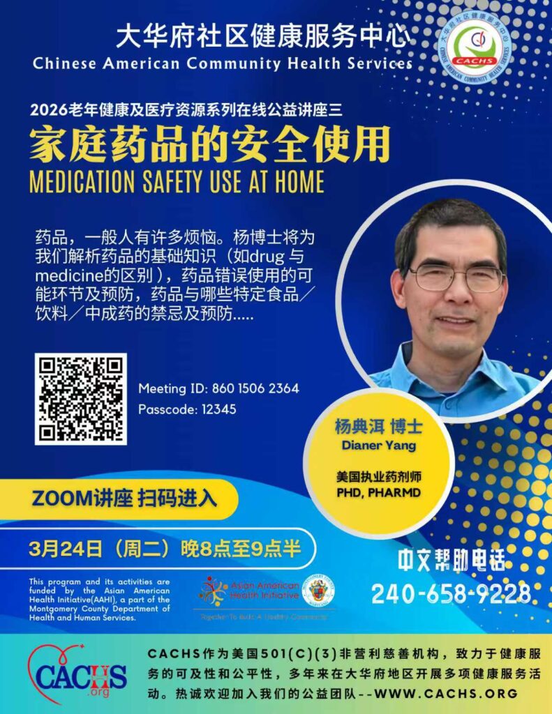 大华府社区健康服务中心健康讲台-老年健康及公共医疗福利资源在线系列讲座第三场预告-家庭药品的安全使用