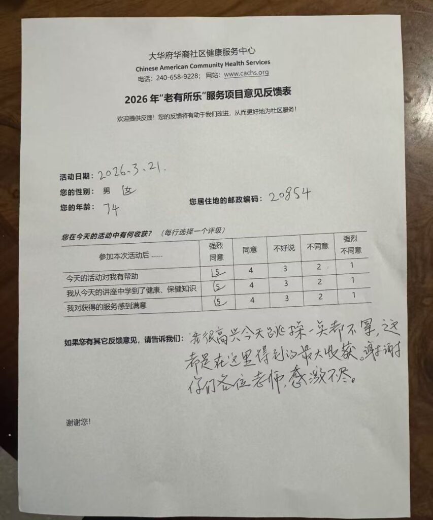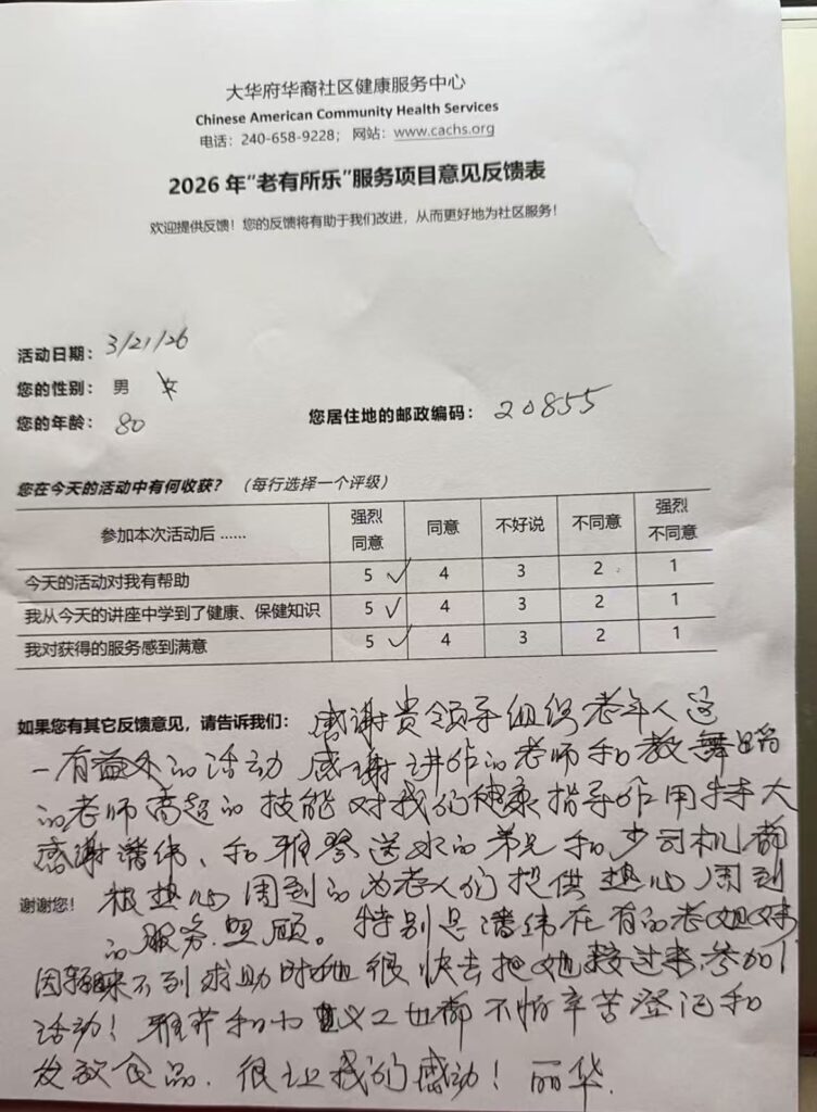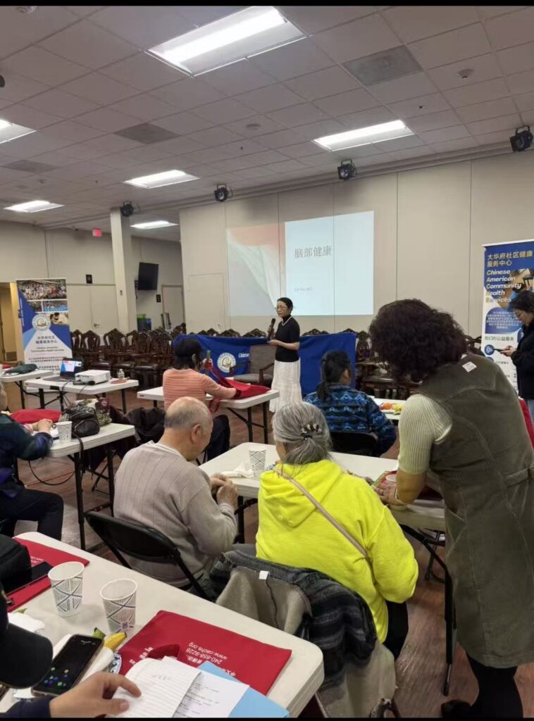 Organization News “2026老有所乐第一期”活动简讯之十 Updated on April 2, 2026 by admin 与大脑相关的疾病在老年人群中高发,也是大家非常关心的话题。本期“老有所乐”先后安排了老人精神心理疾病、中风、失智症和失眠等疾病的相关讲座,为大家科普这些疾病的发病、治疗和预防。3月21号的“老有所乐”活动安排了这一系列讲座的收官之作,由精神内科执业医生徐磊博士带来的“老年人大脑的健康维护”,再次呼吁大家养成良好的生活和健脑习惯,维护大脑健康,从而有效预防和远离这些与大脑相关的疾病。徐医生首先跟大家简要讲解了大脑的功能。作为人体的神经中枢,大脑承载了一个人的个性和所有的记忆,由大脑损伤或者衰老引发的功能障碍往往对个人的生活产生重大的长期影响,包括思维、记忆力、协调能力、语音功能及情绪等。所以,保持大脑的健康非常重要!徐医生指出养成脑部健康习惯是保持大脑健康的关键途径,这些习惯包括:积极锻炼,有助于保持头脑清醒,并改善平衡感、灵活性、力量、精力及情绪。徐医生给出的建议是每周进行至少150分钟的中等强度有氧运动(例如快走),或者每周进行 75 分钟的高强度有氧运动(例如慢跑)。保护头部,包括在进行有头部受伤风险的活动(例如骑自行车、滑雪、骑马,或驾驶摩托车)时,请务必佩戴头盔;在车内系好安全带有助于避免头部受到撞击;防止跌倒等。维持身体健康,某些疾病(最常见的包括糖尿病、心脏病和高血压)可能会增加损伤思维和记忆的风险,并且也有可能增加卒中的风险,从而损害大脑健康。所以保持健康的身体也是保持大脑健康关键。开展积极的社交活动,远离社交隔离,排解孤独,有助于抵制抑郁和压力,保持大脑健康。确保充足且良好的睡眠,有助于改善大脑功能和记忆力,缓解压力和抑郁。徐医生特别提醒大家,如果打鼾干扰了睡眠的话,应及时就医。因为打鼾可能是睡眠障碍的征兆,如睡眠呼吸暂停,可能会增加思维能力下降和失智症的风险。健康的饮食,比如地中海饮食,有助于预防或延缓出现失智症状,是维护脑部健康的有效途径。挑战大脑,挑战性的、积极的脑力活动有助于保持大脑健康,并改善大脑功能和记忆力,比如玩填字游戏、阅读、玩游戏、学习演奏乐器、尝试一种新的爱好以及在当地学校或社区团体做志愿者等。谨慎用药并限制饮酒,药物和酒精会影响脑细胞间的通信方式,还会影响大脑的反应、计划、解决问题和控制冲动的能力。徐医生特别强调,为了维持大脑健康,最好是不喝酒。徐医生的讲座深入浅出、娓娓道来,老人们纷纷表示听得明白,很有收获!本周“老有所乐”的娱乐环节是银环老师带来的老人健康舞蹈。伴着或欢快或悠扬的音乐,大家跟着老师一起摇摆舞动,身心都得到了锻炼和放松。最后,大华府社区健康服务中心的资深义工魏向阳用投屏的方式给老人们讲解ChatGPT及其使用的要领和技巧。带领大家挑战大脑、维持脑部健康! (张柏萌 撰稿) First name Last name Email By submitting, you agree to receive text messages at the provided number from Chinese American Community Health Services. Message frequency varies, and standard message and data rates may apply. You have the right to OPT-OUT receiving messages at any time. To OPT-OUT, reply "STOP" to any text message you receive from us. Reply HELP for assistance.